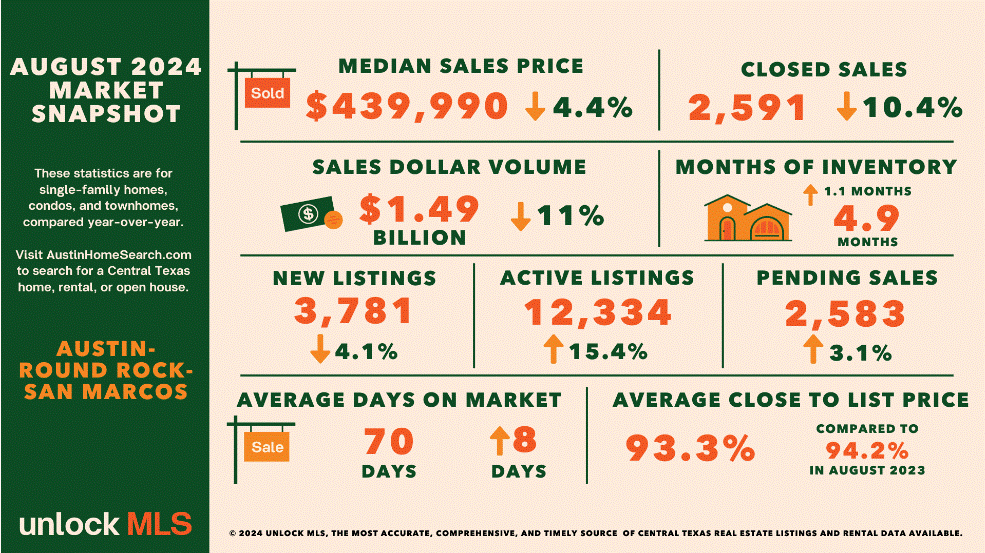 “In August, active home listings in the Austin-Round Rock-San Marcos MSA housing market increased by 15.4%, while the median home price dropped by 4.4% to $439,990, according to Unlock MLS’ Central Texas Housing Report. While these factors indicate more opportunity for buyers, home prices need to decrease further to significantly impact sales growth across the region.