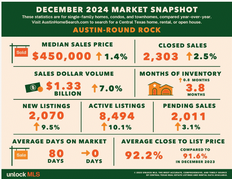 “In 2024, closed sales across the Austin-Round Rock-San Marcos MSA remained stable, ticking down 0.5% to 29,872 sales, according to the December 2024 and Year-End Central Texas Housing Market Report released by Unlock MLS today. During the same period, active listings saw an increase of 14.7% to 132,993 listings offering buyers more opportunities. Together, the data reflects buyers’ ability to find homes that meet their needs within the current market conditions and sellers viewing the market as favorable.