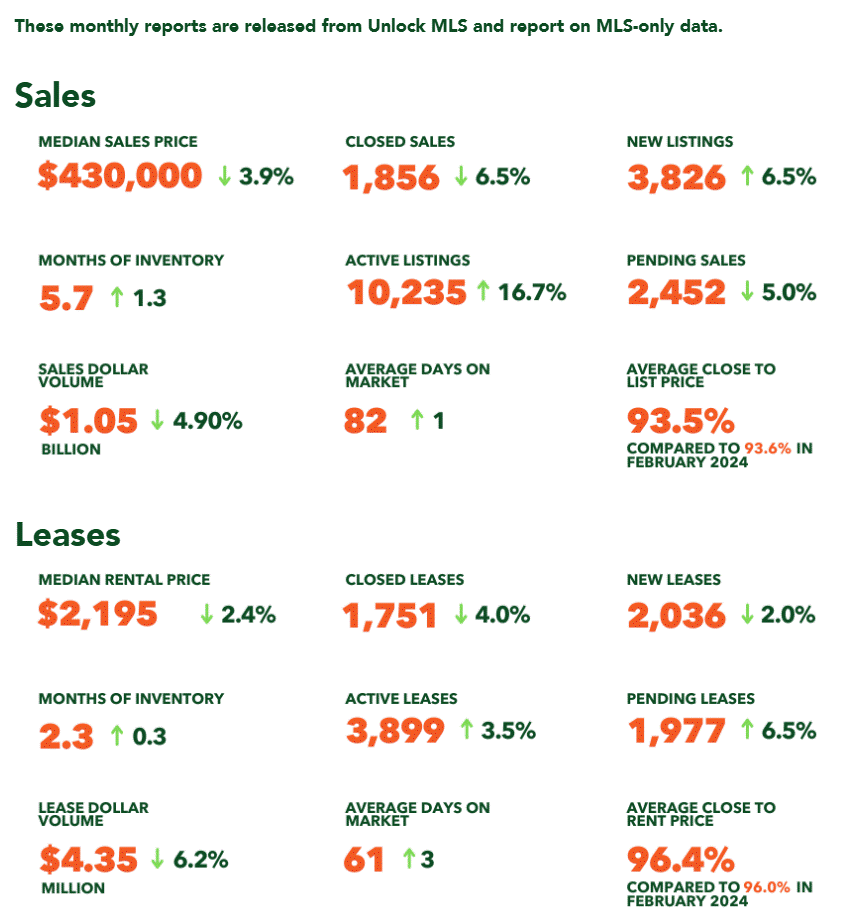 $430,000 – Median price for residential homes, 3.9% less than February 2024.