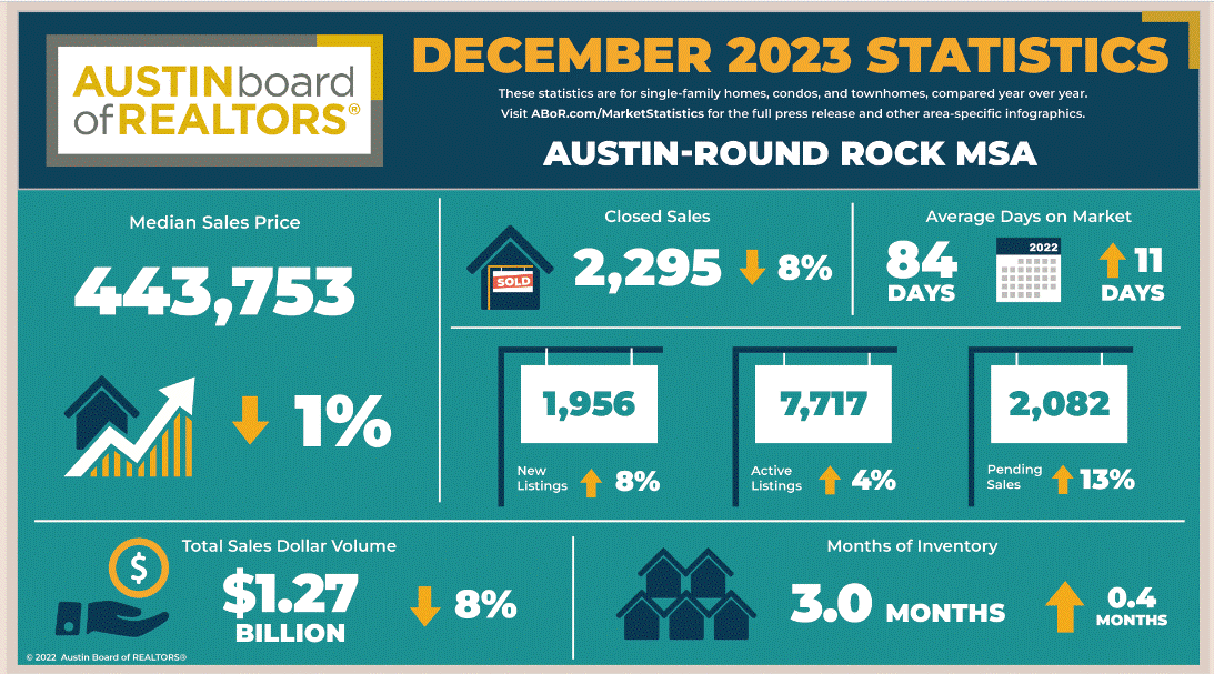 In the News: The Austin Board of REALTORS® says that in 2023, ‘the median price for a home in the Austin-Round Rock MSA decreased 10.2% to $450,000, according to the Austin Board of REALTORS® December 2023 and Year-End Central Texas Housing Market Report. When compared to the steep 24.2% decline in pending sales in 2022, 2023 saw a slight 3.0% decline to 30,353 sales emphasizing that the Central Texas housing market continues to find its footing despite macroeconomic factors impacting the broader housing market and economy.