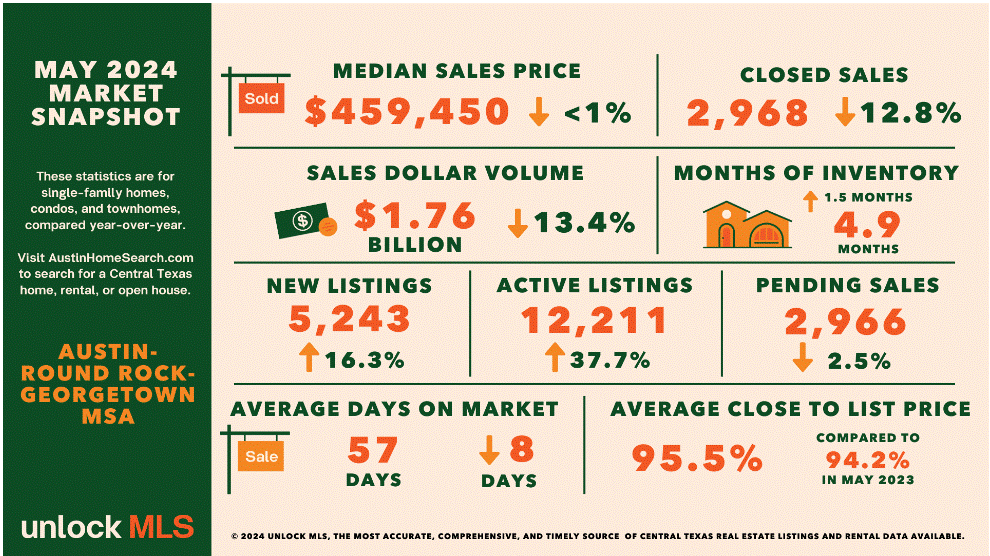 In the News: According to the Austin Board of REALTORS® and their service, Unlock MLS, the Austin metro area market in May “saw a 12.8% decline in closed listings with 4.9 months of available inventory, a level that hasn’t been seen in 13 years according to the latest Central Texas Housing Report released by Unlock MLS. Meanwhile, active listings ticked up 37.7% year-over-year. Because of this increase in available options, buyers have the power to be more selective when purchasing a home.